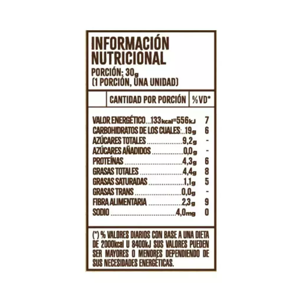 Beneficios y ventajas del producto: Esta barra está compuesta por ingredientes naturales que aportan antioxidantes y nutrientes esenciales. Ideal para personas de todas las edades que llevan un estilo de vida activo o desean incorporar opciones veganas en su dieta.